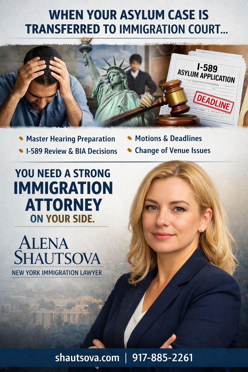 If your asylum case has been transferred to court, do not face it alone. Work with a New York Immigration Lawyer who understands asylum litigation, court deadlines, motions practice, and how to protect your claim.